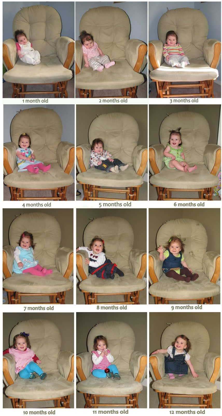 Karin's only 10 days away from turning 1 year old. I didn't get around to composing the 11 month photo in with the rest until just now. Her messy hair looks funny now that she's had a haircut. Hopefully January's photo will be more carefully organized -- tsk tsk, Baby is wearing nearly the same outfit 2 months in a row, what a fashion faux pas!